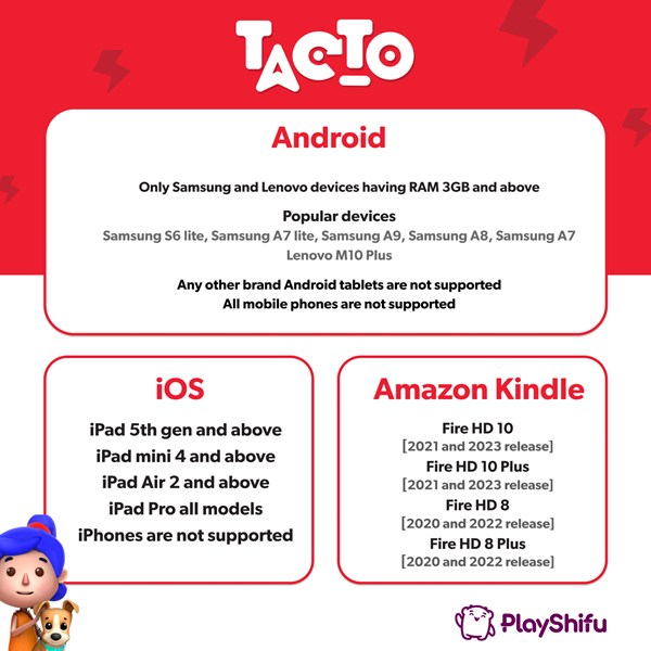 - DEVICE COMPATIBILITY: iOS - iPad 5 & above, iPad Mini 2 & above, iPad Air, iPad Pro (Note: iPad 2 and iPad Mini 1 are not supported) | Android - Samsung (A7 Lite, S6 Lite, S7 - 11", Galaxy Tab A8 - 10.5", Galaxy Tab A7 - 10.4") and Lenovo (M10 Plus - Gen1, Tab M8 - 2nd Gen, M10 Plus - Gen3) | Amazon Fire: HD 10 - 2021 (11th gen), HD 10+, 8+, 8 - 2020 and 2021 (Note: Fire 7 is not supported). Check the compatibility dashboard on the official PlayShifu website for the full list of compatible devices.