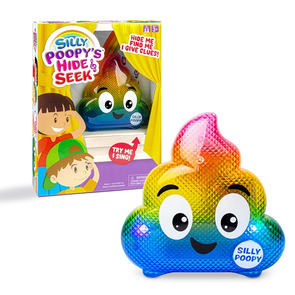Silly Poopy's Hide & Seek is rainbow plastic singing, talking and light up toy named Silly Poopy who makes any hide and seek game hilariously entertaining. Kids everywhere will be singing "yippee yoopee!